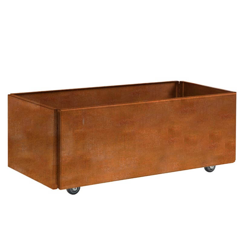 Her får du en komplet plantekasse med hjul lavet i råjern i et smukt design, som får et rustikt og rustent udseende.