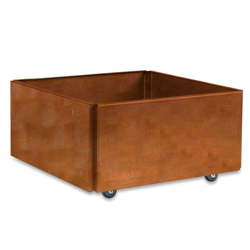 Her får du en komplet plantekasse med hjul lavet i råjern i et smukt design, som får et rustikt og rustent udseende.